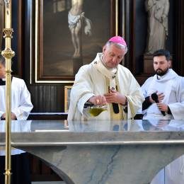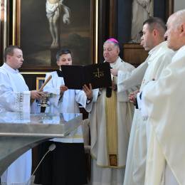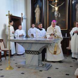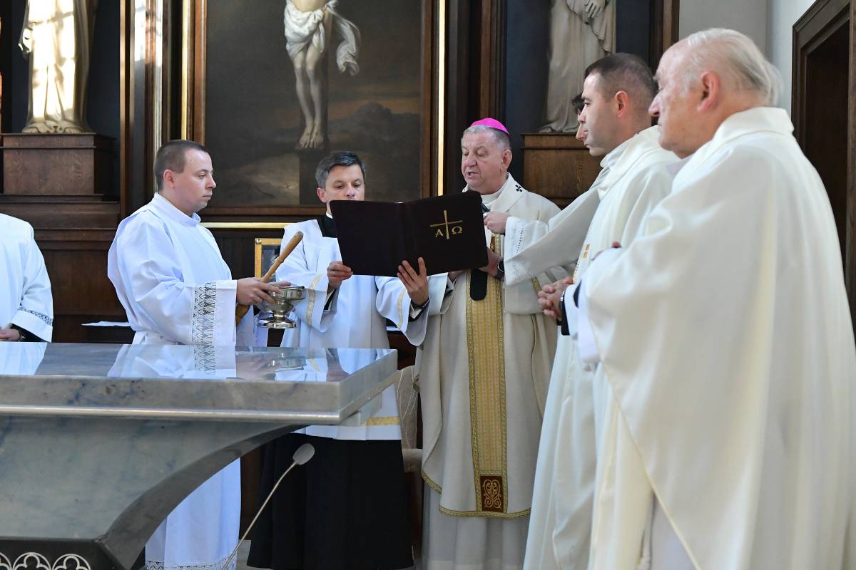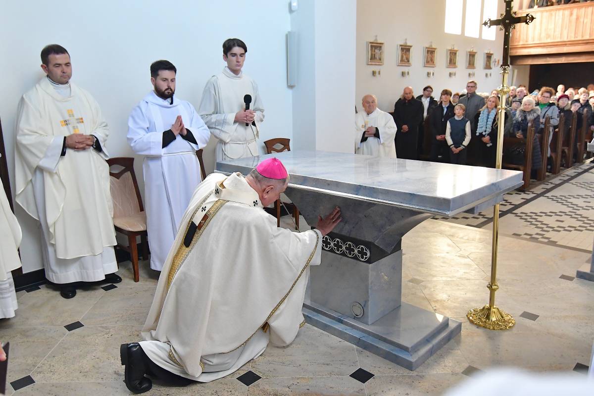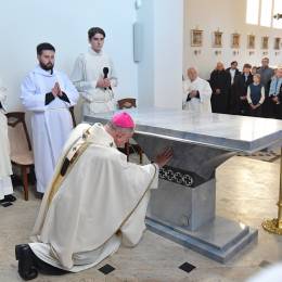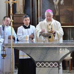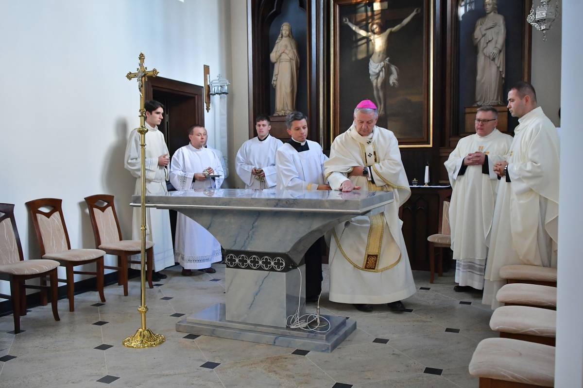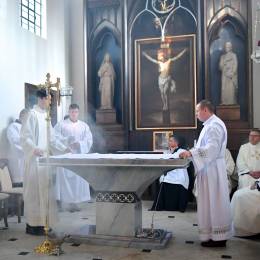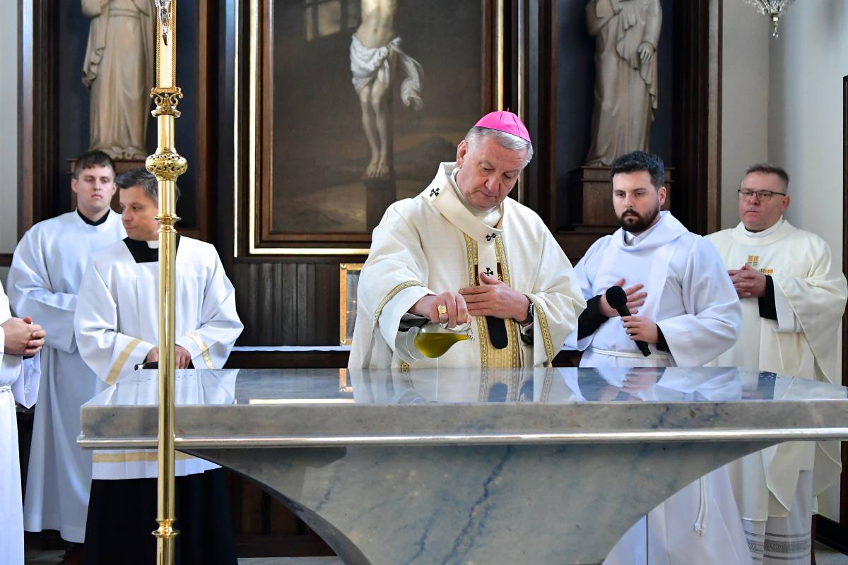W obrzędzie wyrażającym wspólnotę Chrystusa ze swoim Kościołem, po Litanii do Wszystkich Świętych, abp Guzdek namaścił olejem Krzyżma św. ołtarz, w którym umieścił relikwie bł. ks. Jerzego Popiełuszki i odmówił modlitwę poświęcenia. W czterech miejsca ściany świątyni namaścili kapłani.