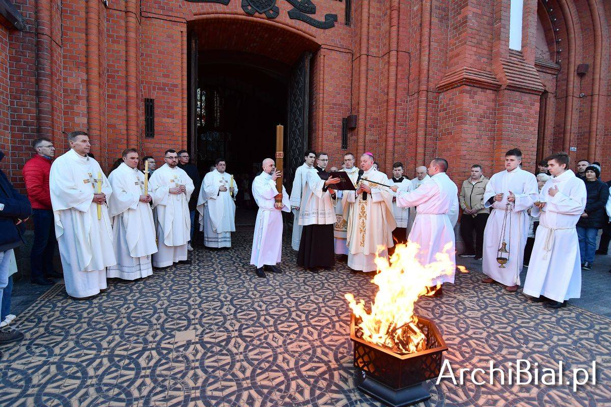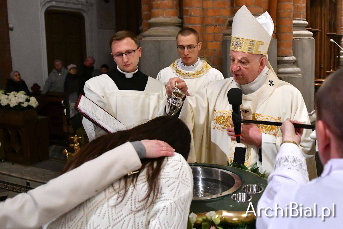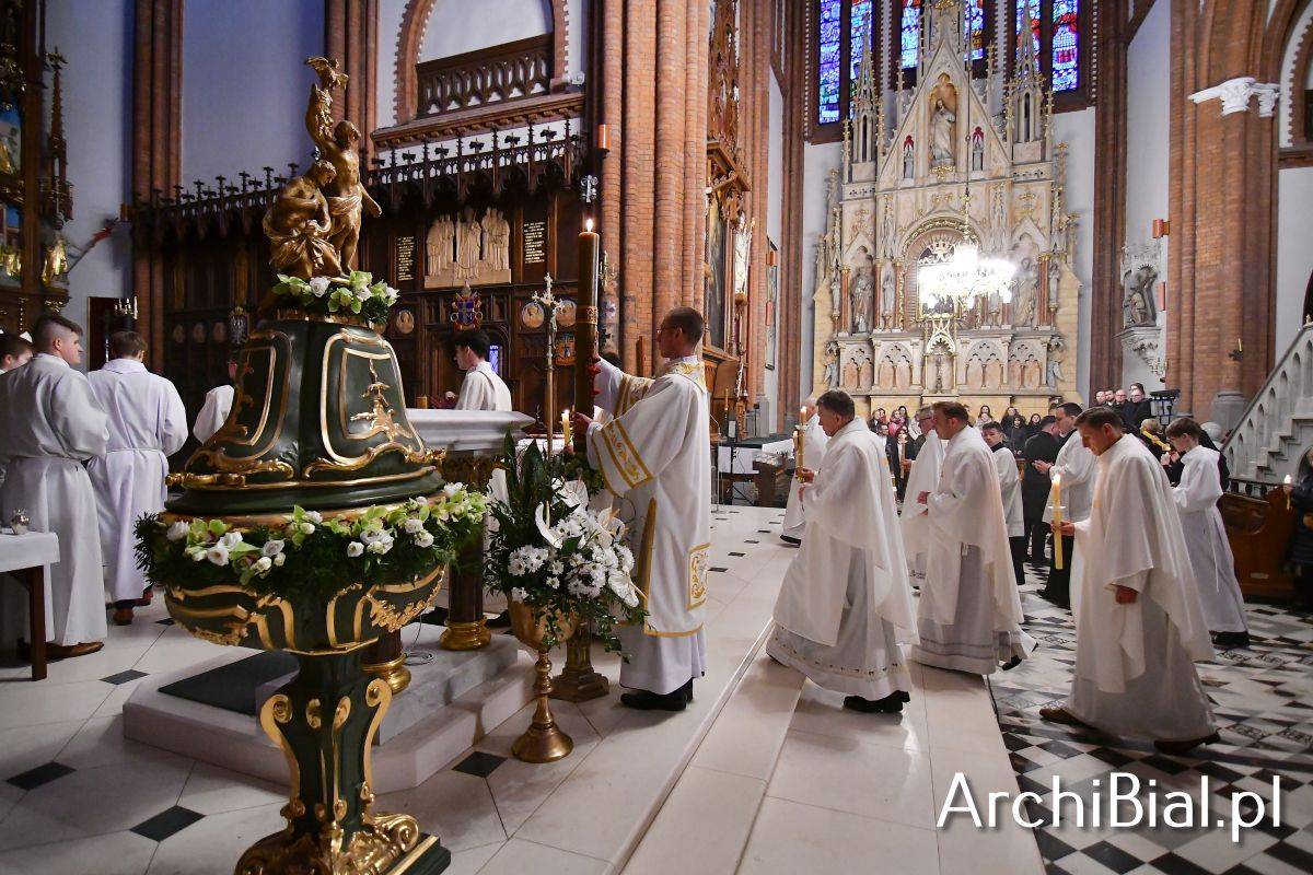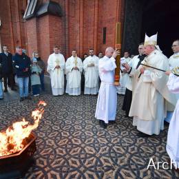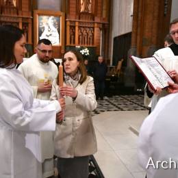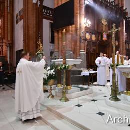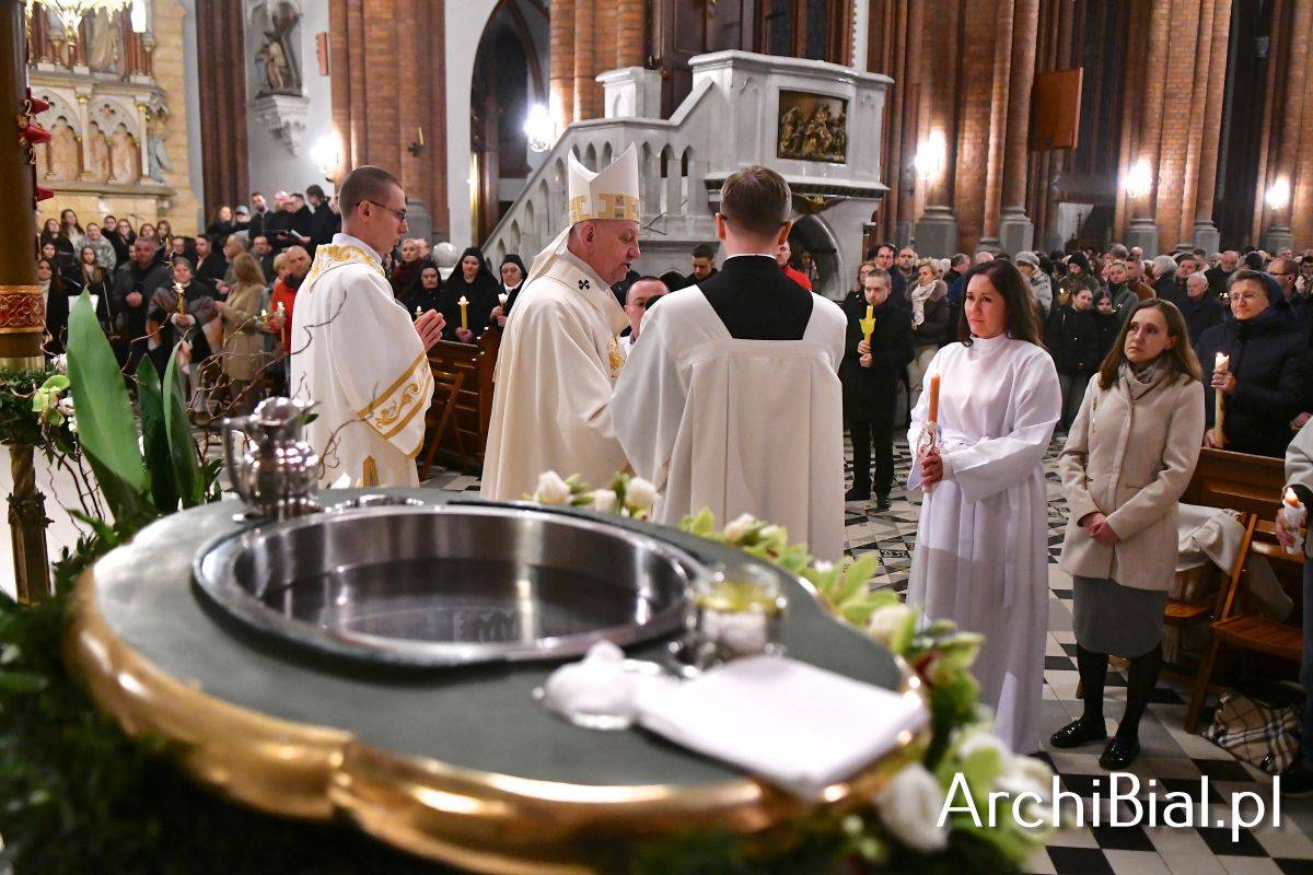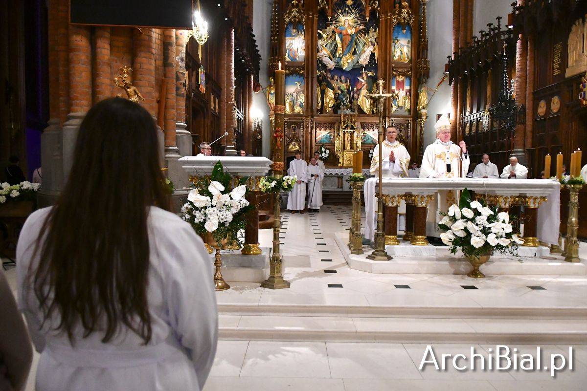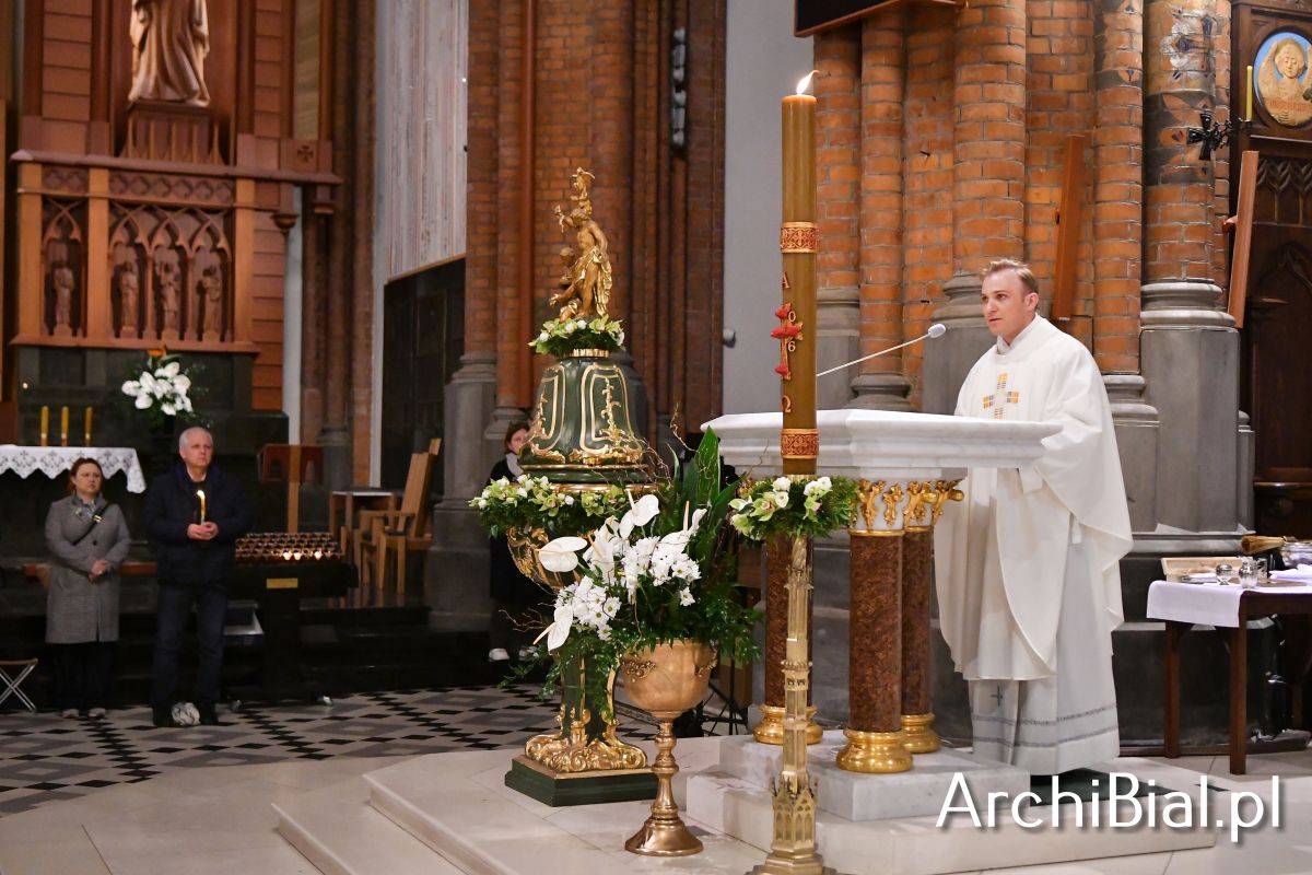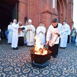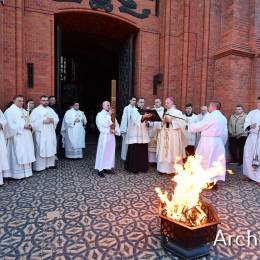 Wielkosobotnim wieczorem zgromadziliśmy się w Bazylice Archikatedralnej aby rozpocząć obchód Świąt Paschalnych uroczystą Wigilią Paschalną. Składała się ona z kilku istotnych elementów: poświęcenia ognia i zapalenia świecy paschalnej, śpiewu uroczystego orędzia wielkanocnego, rozbudowanej Liturgii Słowa, opowiadającej historię zbawienia, Liturgii Chrzcielnej podczas której katechumenka otrzymała sakramenty chrztu i bierzmowania, a wszyscy zgromadzeni odnowiliśmy przyrzeczenia chrzcielne oraz Komunii Świętej wielkanocnej. Śpiew podczas liturgii prowadziły połączone schole parafialne – Winnica i Adonai.