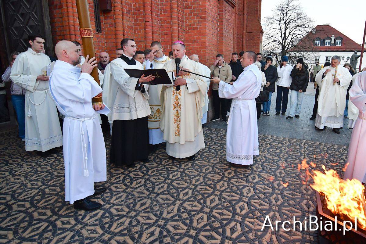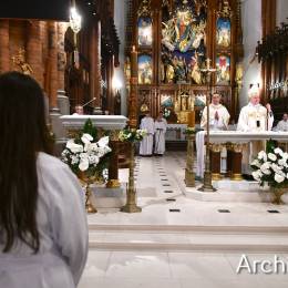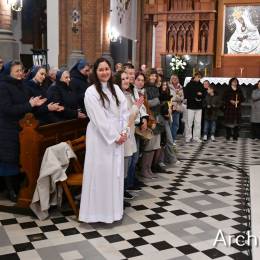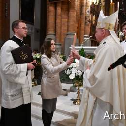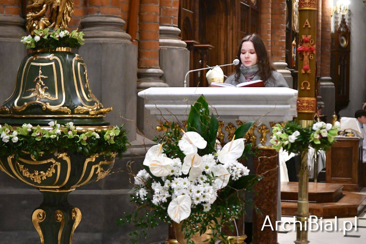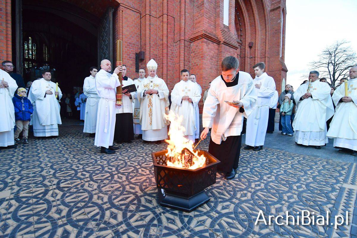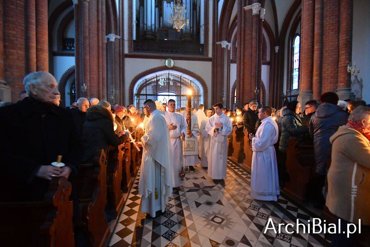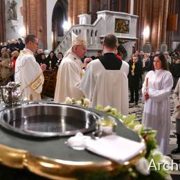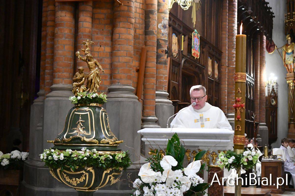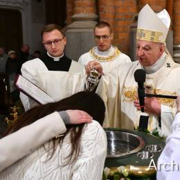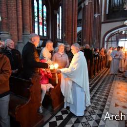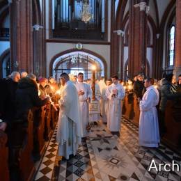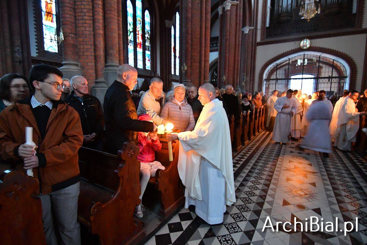 Wielkosobotnim wieczorem zgromadziliśmy się w Bazylice Archikatedralnej aby rozpocząć obchód Świąt Paschalnych uroczystą Wigilią Paschalną. Składała się ona z kilku istotnych elementów: poświęcenia ognia i zapalenia świecy paschalnej, śpiewu uroczystego orędzia wielkanocnego, rozbudowanej Liturgii Słowa, opowiadającej historię zbawienia, Liturgii Chrzcielnej podczas której katechumenka otrzymała sakramenty chrztu i bierzmowania, a wszyscy zgromadzeni odnowiliśmy przyrzeczenia chrzcielne oraz Komunii Świętej wielkanocnej. Śpiew podczas liturgii prowadziły połączone schole parafialne – Winnica i Adonai.