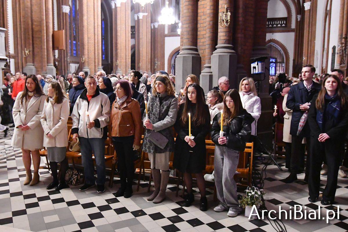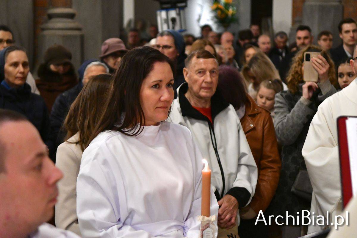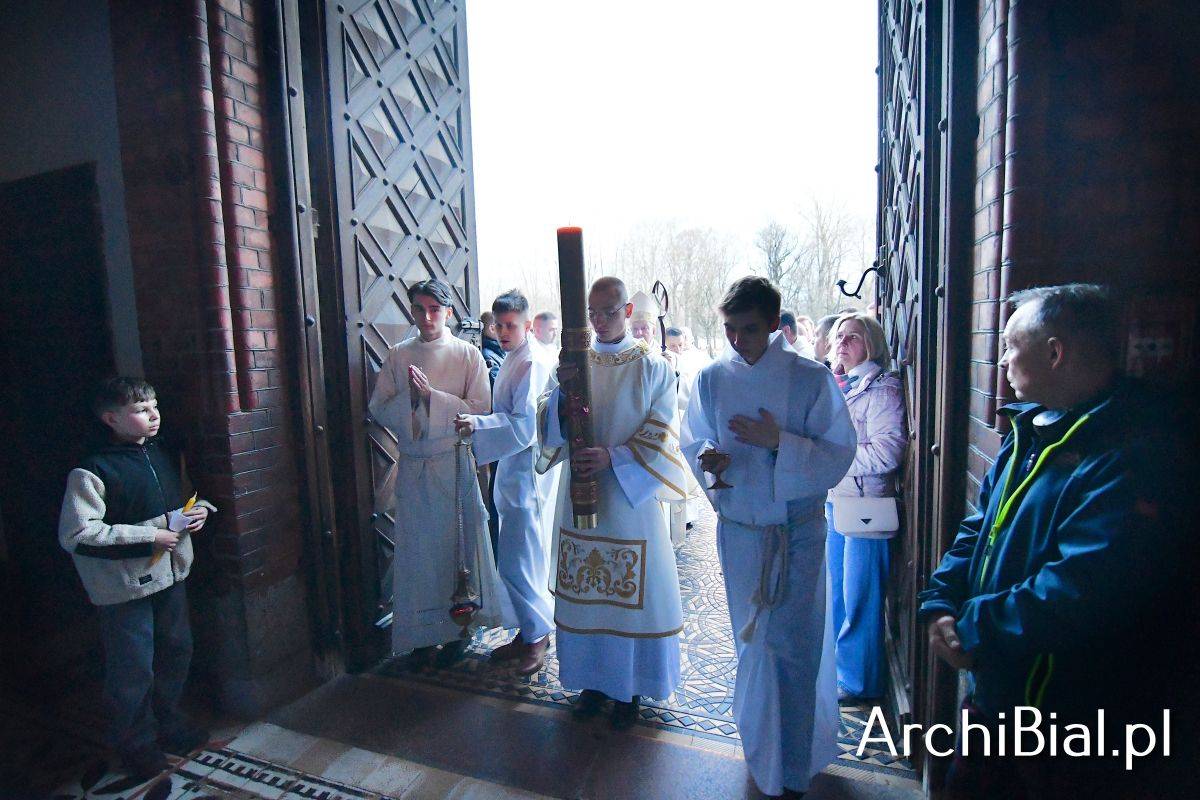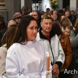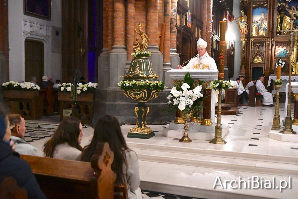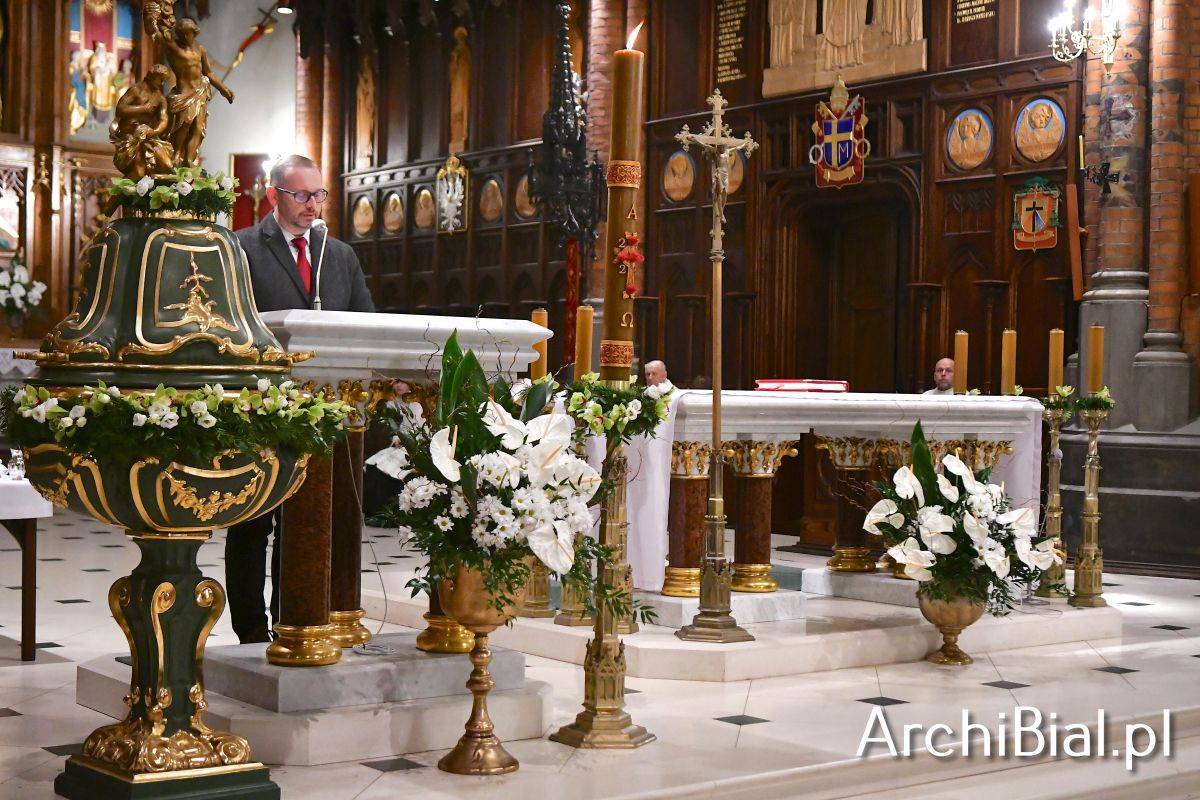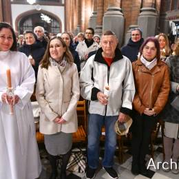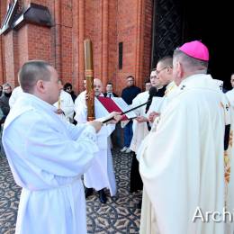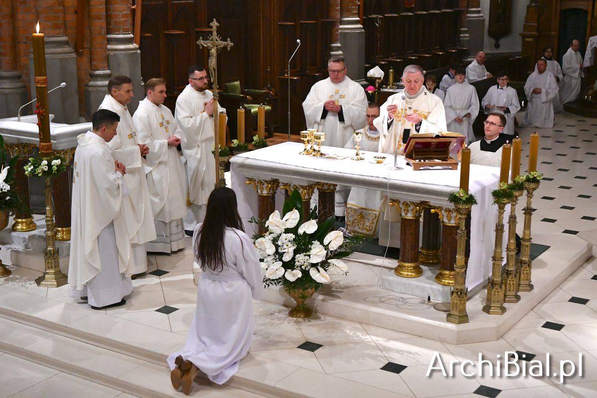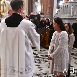 Wielkosobotnim wieczorem zgromadziliśmy się w Bazylice Archikatedralnej aby rozpocząć obchód Świąt Paschalnych uroczystą Wigilią Paschalną. Składała się ona z kilku istotnych elementów: poświęcenia ognia i zapalenia świecy paschalnej, śpiewu uroczystego orędzia wielkanocnego, rozbudowanej Liturgii Słowa, opowiadającej historię zbawienia, Liturgii Chrzcielnej podczas której katechumenka otrzymała sakramenty chrztu i bierzmowania, a wszyscy zgromadzeni odnowiliśmy przyrzeczenia chrzcielne oraz Komunii Świętej wielkanocnej. Śpiew podczas liturgii prowadziły połączone schole parafialne – Winnica i Adonai.